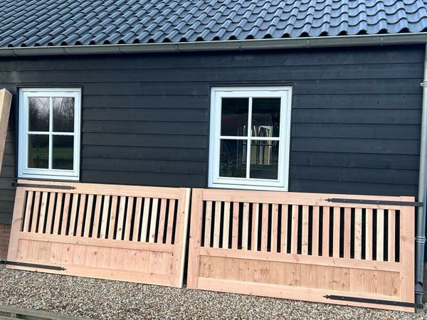 Inclusief verstelbare gehengen, schuifgrendel en een paal 150 x 150 MM waarvan een gedeelte is zwart geteerd.